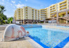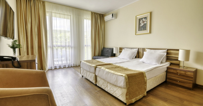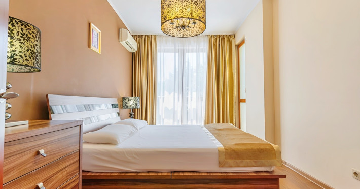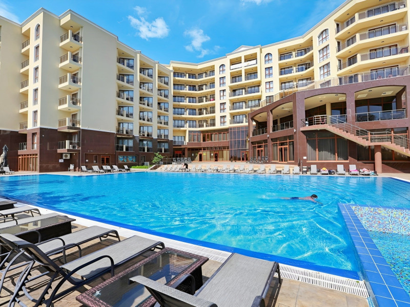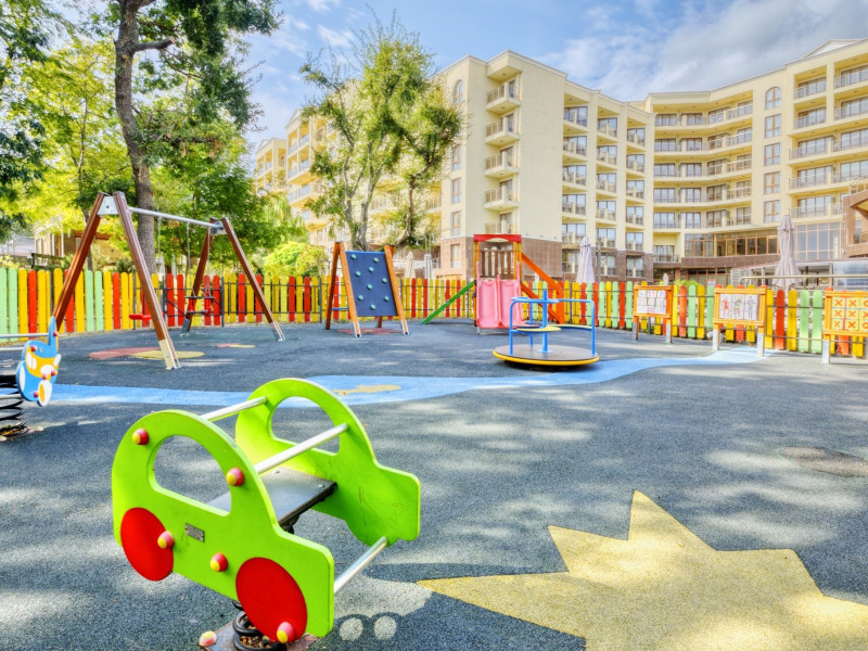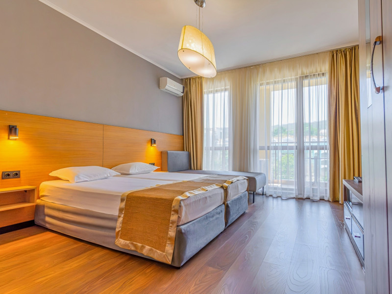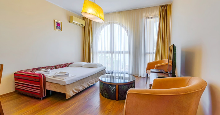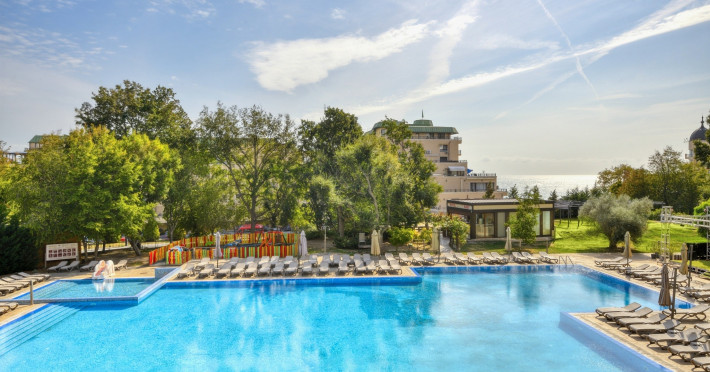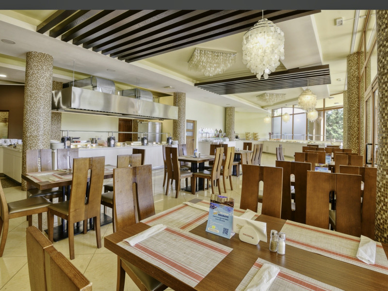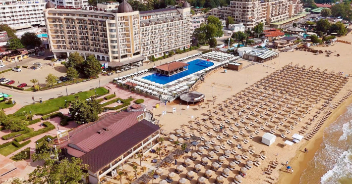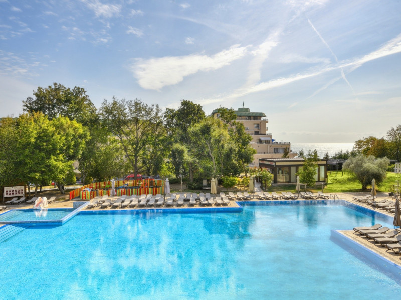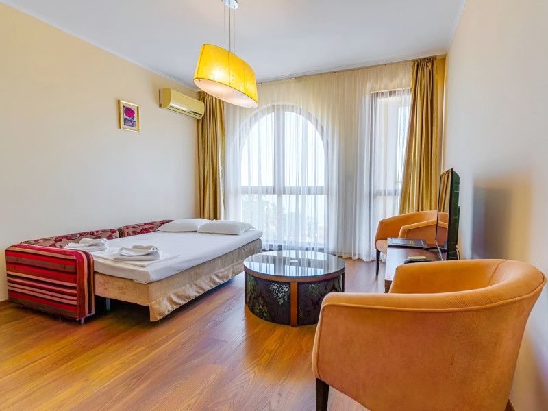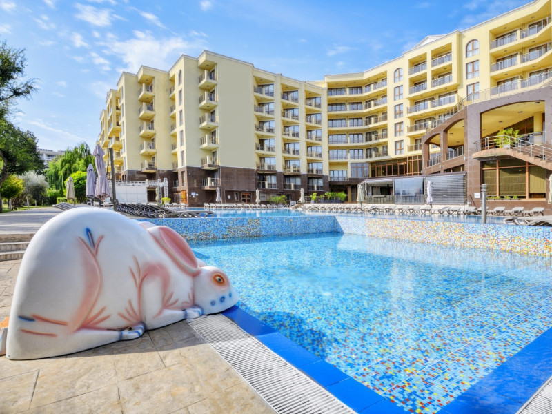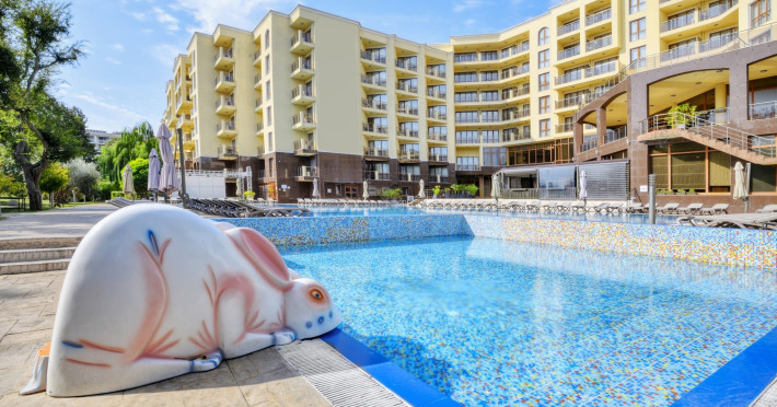 Hotelul Golden Line se gaseste la marginea statiunii foarte populare Zlaté Pisky si ofera conditii pentru o vacanta netulburata clientilor de toate varstele. Va puteti caza in apartamente si studiouri mobilate confortabil, dotate cu o chicineta. Se poate alege dintre cazare cu mic dejun pentru cei care prefera self-catering, sau programul All Inclusive. Datorita locatiei sale la marginea statiunii, hotelul este o alegere potrivita pentru o vacanta linistita, netulburata, in timp ce centrul statiunii cu optiunile de divertisment este la cativa pasi. Pentru copii exista o piscina pentru copii cu tobogan, un loc de joaca pentru copii si programe de animatie in timpul zilei.