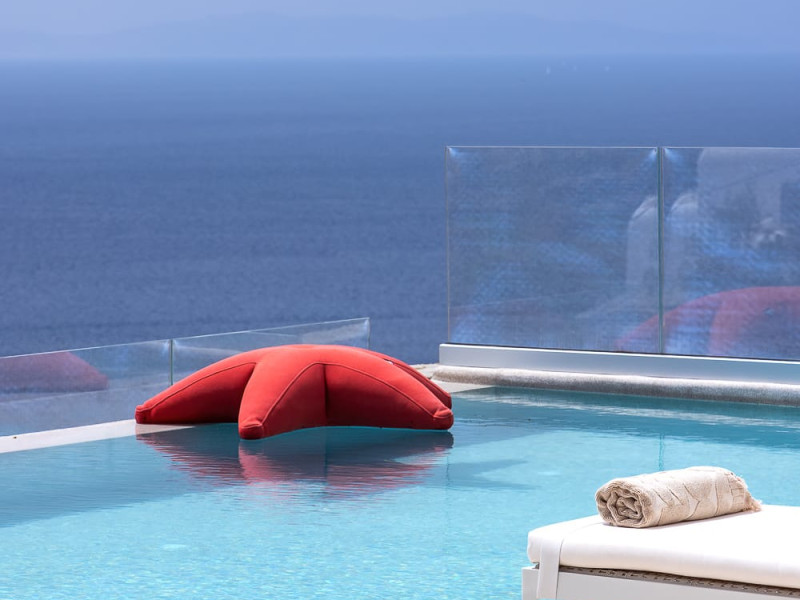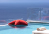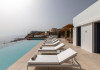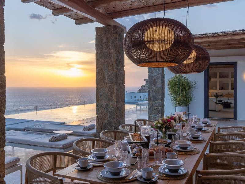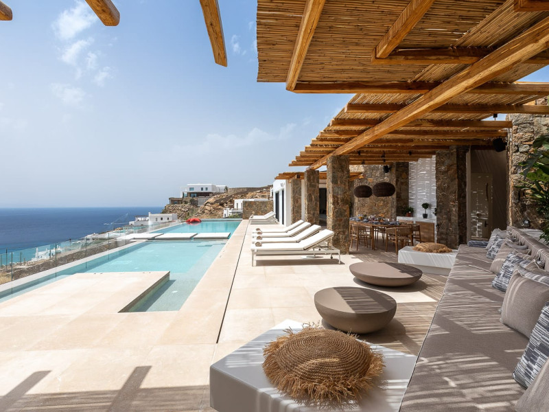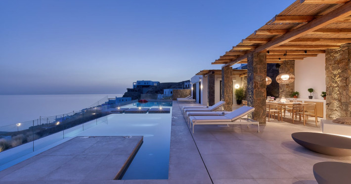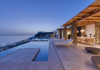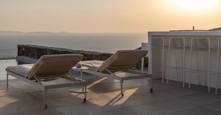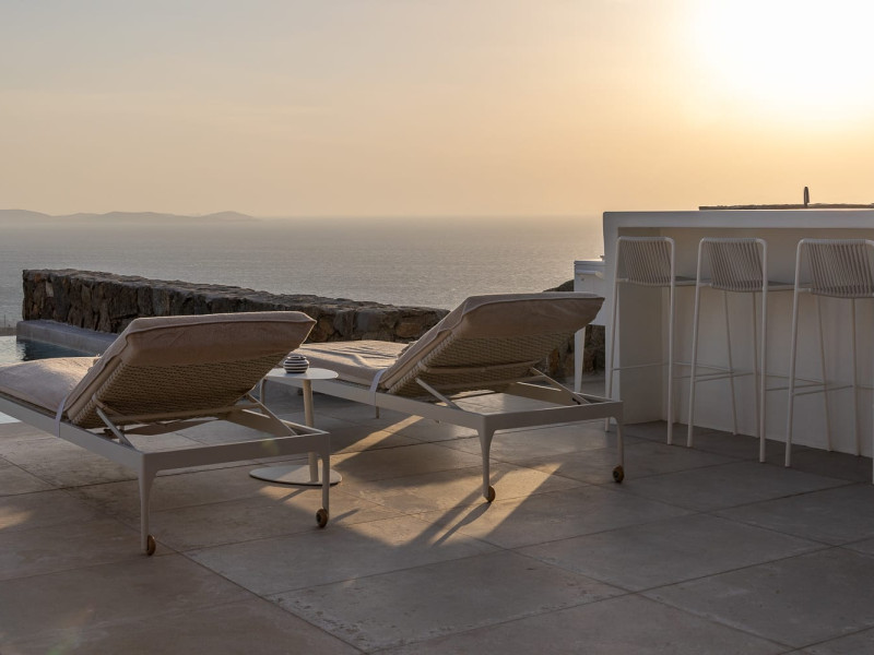 The villa’s expansive terrace is an outdoor sanctuary. Centered around a heated infinity pool, the space also includes stylish sun loungers, a shaded alfresco dining area, and cozy lounge spots for entertaining or unwinding. The panoramic views of the Aegean Sea and spectacular sunsets create a magical atmosphere for any time of day.