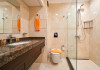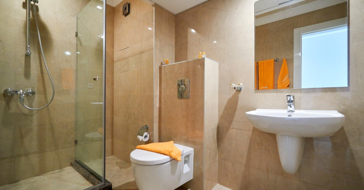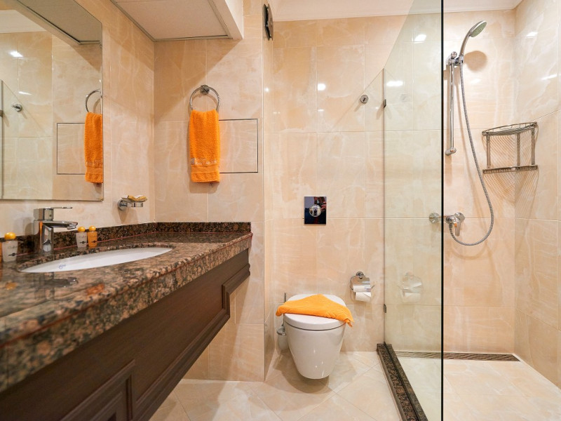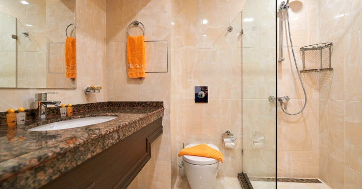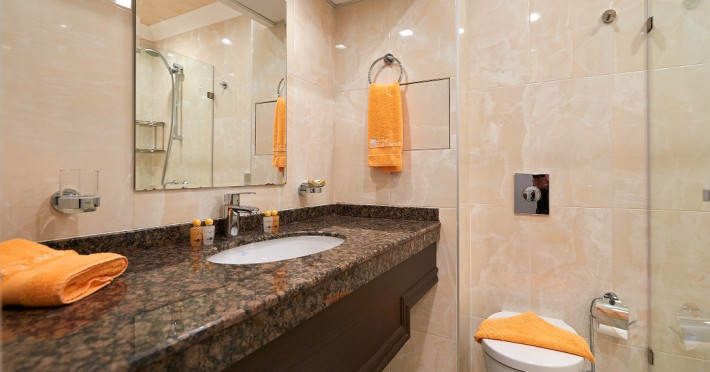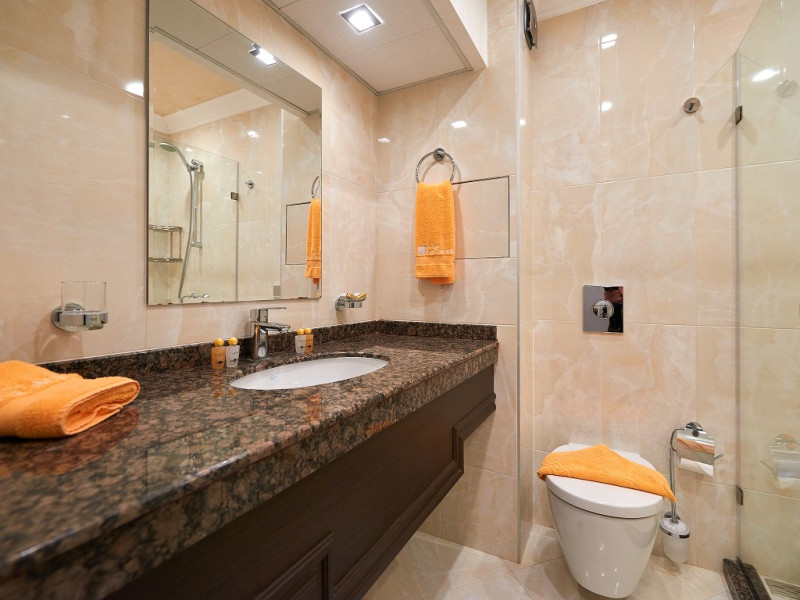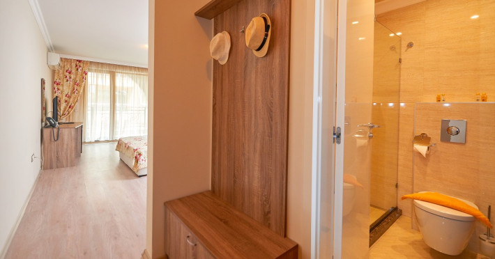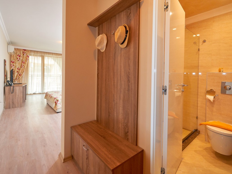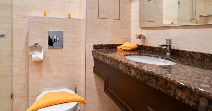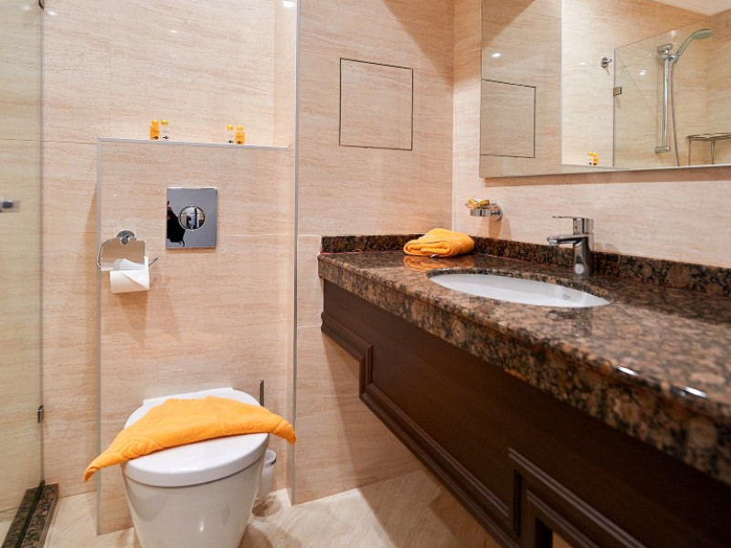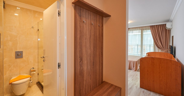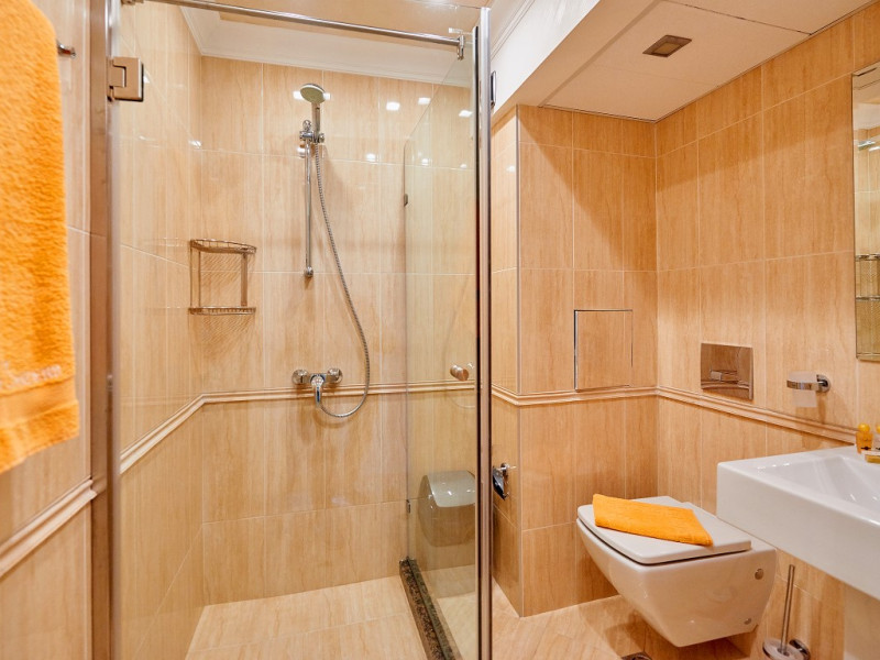 - baie cu cabina de dus, telefon, uscator de par (la cerere la receptie), prosoape, cosmetice pentru baie