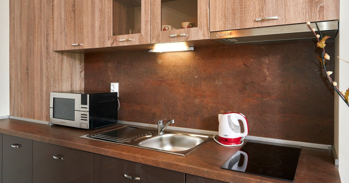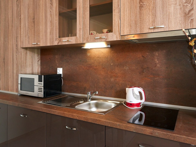 - bucatarie (plita electrica, cuptor cu microunde, frigider, tacamuri, ustensile de bucatarie, gatitul este permis)
