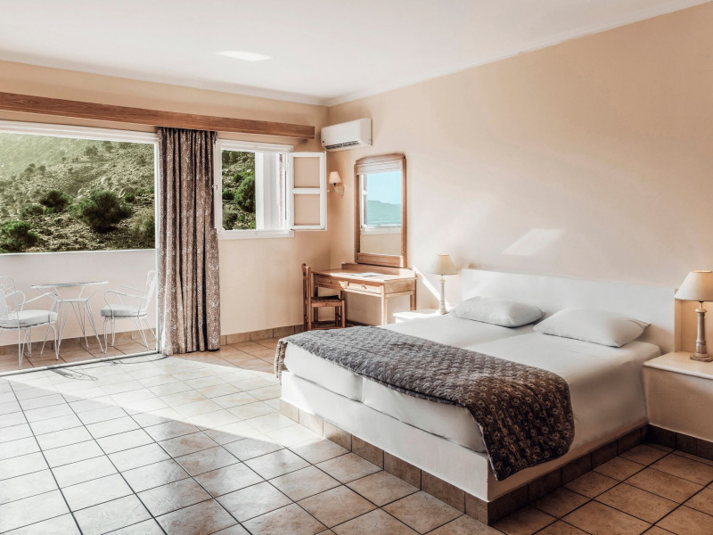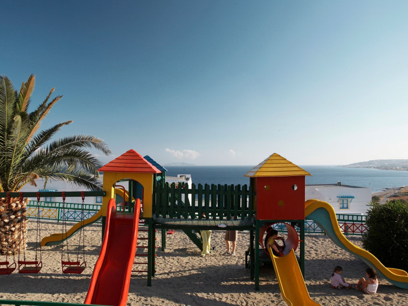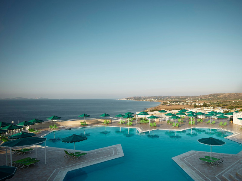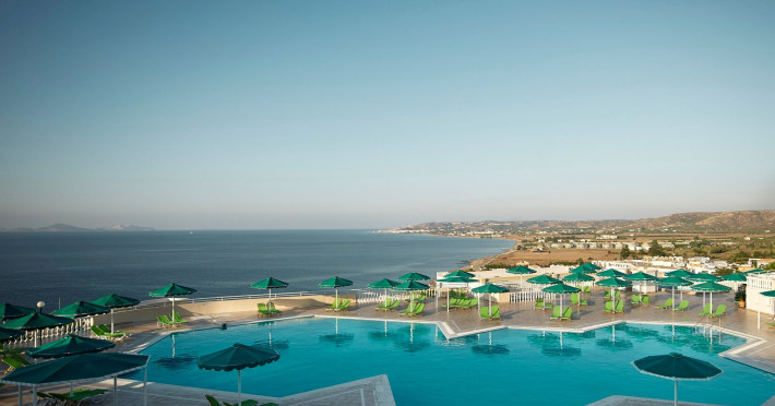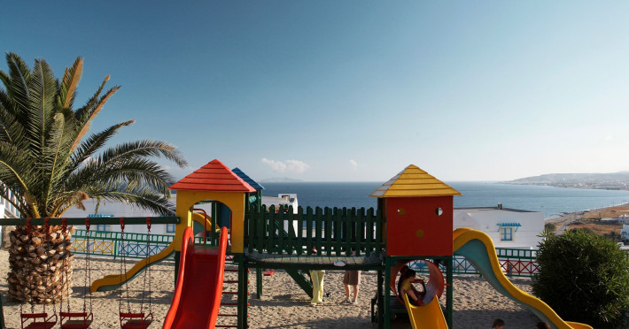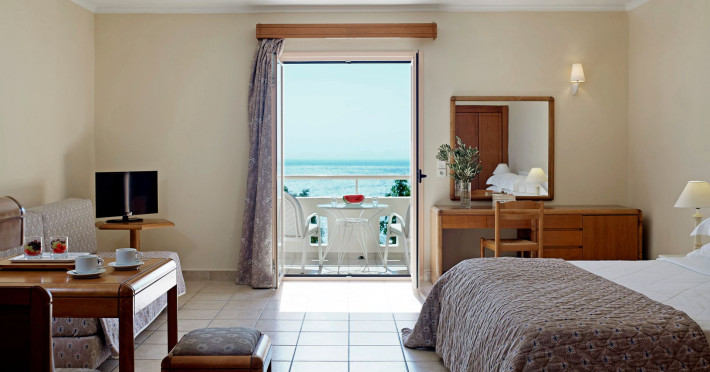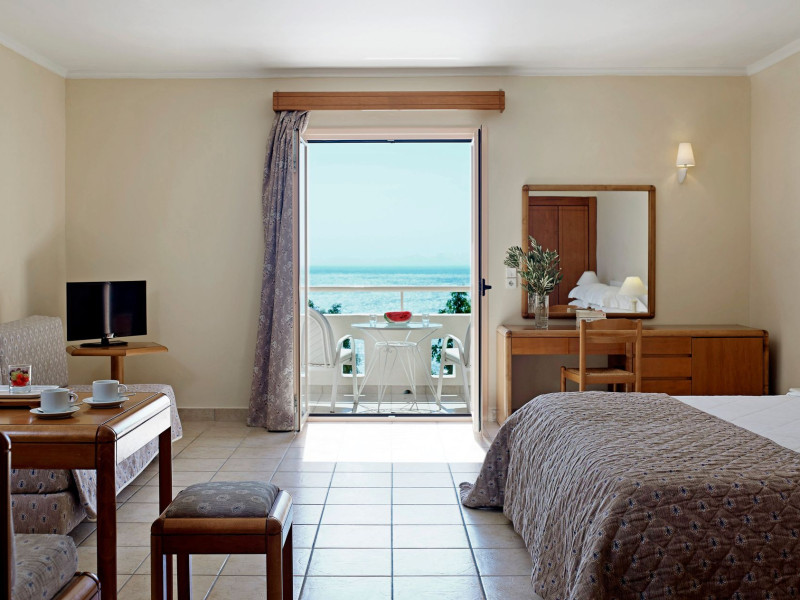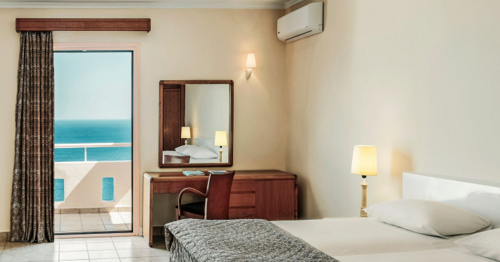 The hotel offers 219 spacious standard and superior rooms with sharing pools, a Mediterranean style décor and an impressive view to the Aegean Sea. Among the available facilities are seawater swimming pools and water slides, a tennis court, beach volley, beach soccer and numerous sports and other recreational activities.