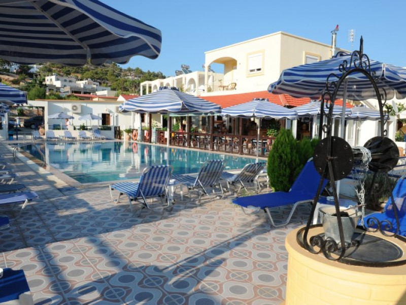 The Hotel is a 2star self catering property of three buildings offering 32 studios and apartments with kitchenette facilities. This property is located in Pefkos with two wonderful sandy beaches. Next to the reception area at the hotel, there is the Pefkos Blue pool bar restaurant for guests enjoyment and entertainment. The pool bar opens early and serves food all day breakfast, lunch and dinner. There is also a large swimming pool, with a separate childrens pool and a dedicated playground area for the children, and a pool table.