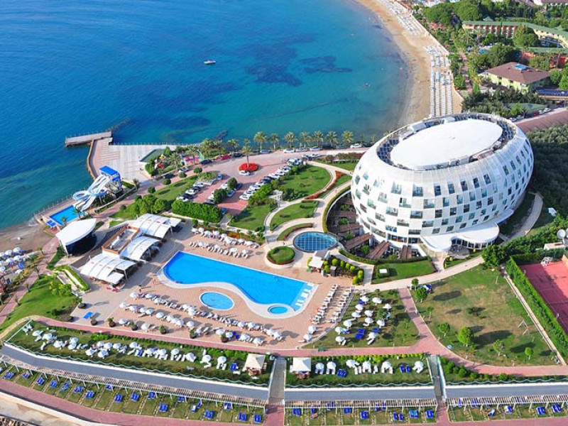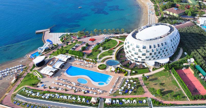 Localizare: Gold Island Hotel 5* ilustrează o formă ovală, deține o amplasare deosebită, fiind situat pe o peninsulă, înconjurat de o plajă privată. În regiunea Alanya, stațiunea Turkler, la 20 km distanță de centrul stațiunii Alanya și 100 km distanță de aeroportul din Antalya.
