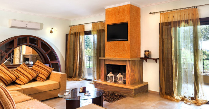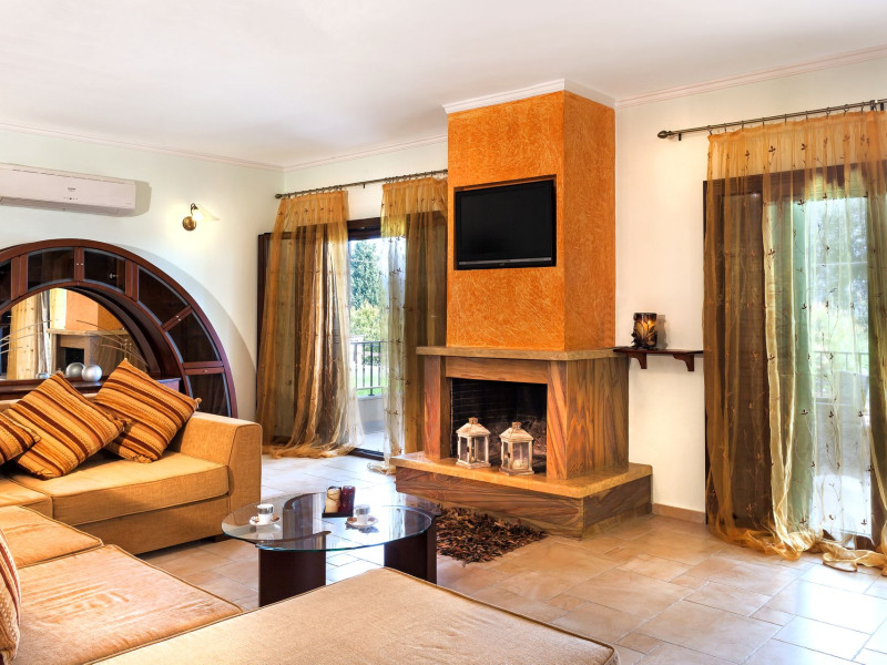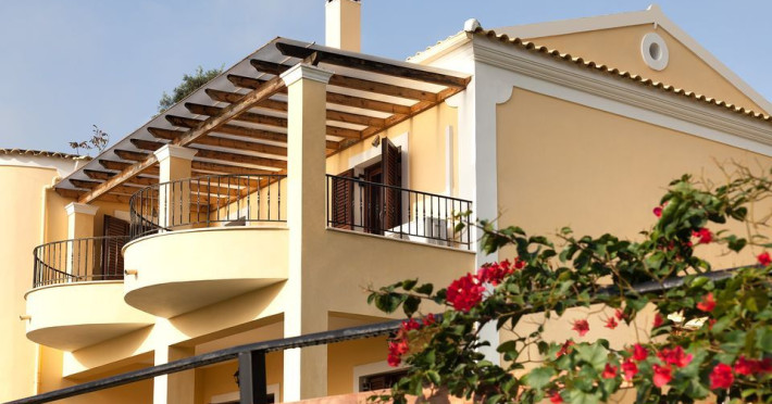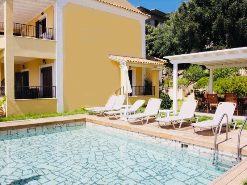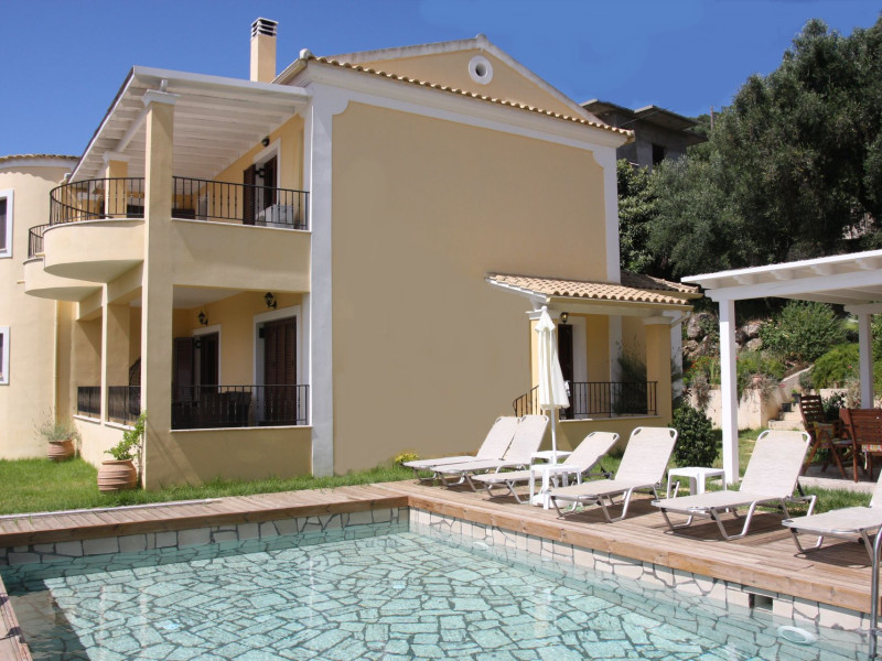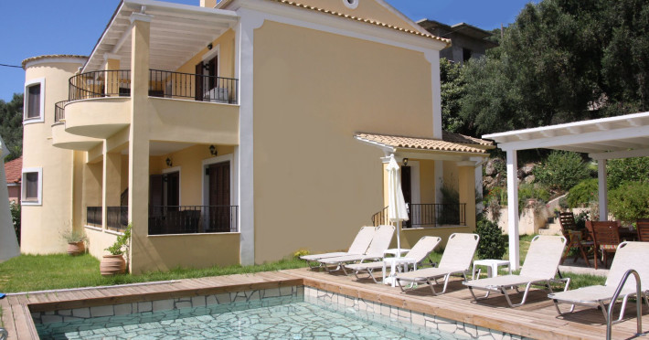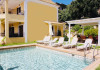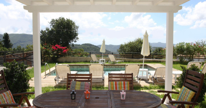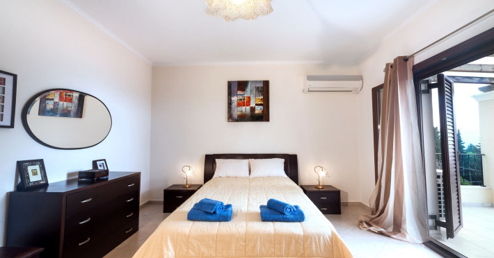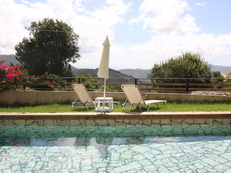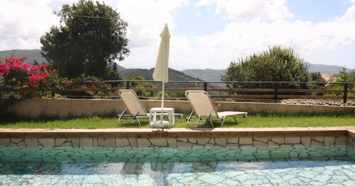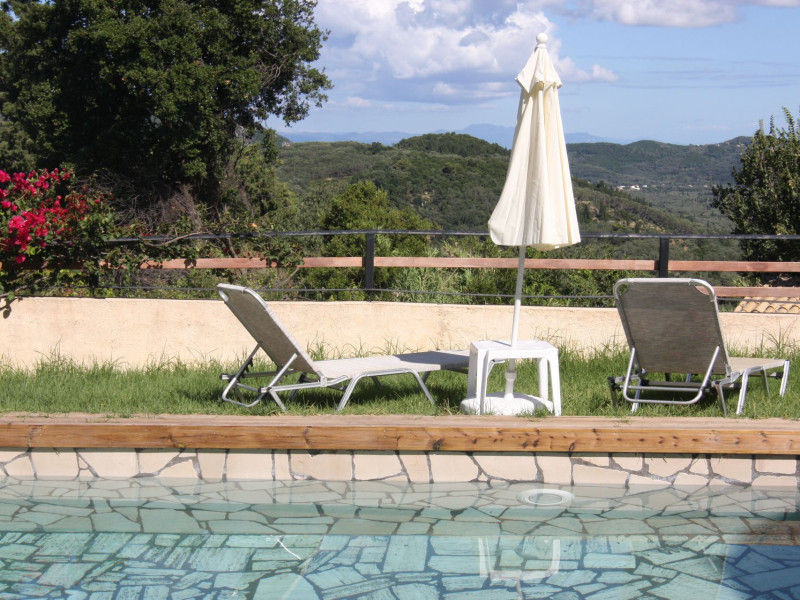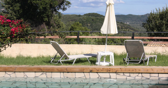 Infinity Villa is situated right in the middle of the island and close to its West side. Its strategic location makes it ideal for travelers keen to explore all the “must visit” attractions and beaches of the largest and most diverse among the Ionian Islands. Built in the heart of the Traditional village of Kato Pavliana, right below the village’s church and campanile, it is completely eye-protected of the main road, thus providing relaxation and tranquility. It is surrounded by unspoiled nature and its revitalizing sounds and offers uninterrupted 180 views to the open countryside, clear Corfiot sky and the vast olive groves onto Paramonas. The renowned sandy beach of Agios Gordios with its crystal clear waters and stunning sunset is at 5 km (9 minute drive through untouched green scenery). The family resort beach of Paramonas is at 5 km (10 minute drive to the other side). The villa is built in respect to the traditional Corfiot Architectural style and features extensive grounds both indoors and outdoors. It can accommodate up to 8 guests with 4 bedrooms and 3 bathrooms, and is an idyllic place for a relaxing holiday for all the family or for groups of friends keen to leave everything behind for a while. The villa is furnished with dark wooden furniture and minimal, yet elegant decoration. Features very spacious rooms and indoor spaces, huge open plan kitchen (fully equipped with brand new electrical appliances and anything you need for preparation of meals) with dining area that can easily sit 10 guests, large living room with adobe fireplace, large verandas (furnished, with outdoor dining area) that open out to the countryside, large and brand new bathrooms and a small gym (for those who wish to leave everything behind except their daily work-out!). The interior marble stairs lead to the upper floor where there are 3 bedrooms and another 2 bathrooms that open to a share shaded-pergola veranda with stunning views to the countryside and the surroundings. The garden is well maintained and has a small dip pool and sun loungers in order for the tenants to luxuriate in their beautiful surroundings. There is a gazebo and another outdoor sitting/dining area behind the dip pool and a small organic vegetable farm, which the owner grows with great passion. Whatever grows in the garden is for its residents, so feel free to pick anything that suits your daily menu and offer yourselves the experience to taste vegetables as they should taste for a while! Parking for 2 car seats is also available within the property premises. Although quiet and peaceful there are many activities, attractions and places of interest within a few minutes’ drive, so a car is essential for those who want to have a complete taste of Corfu!