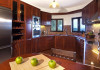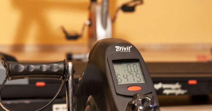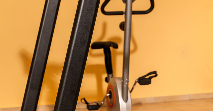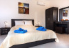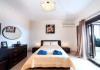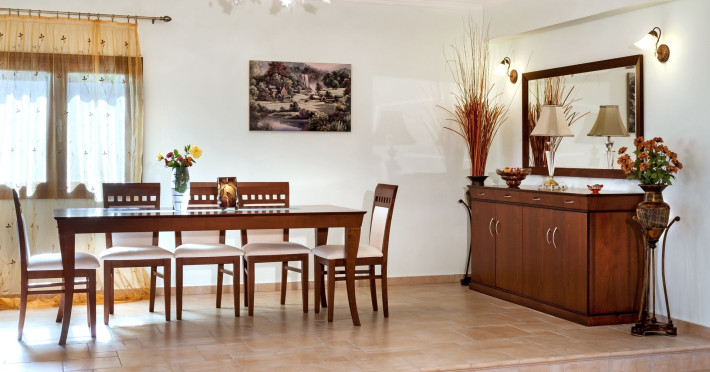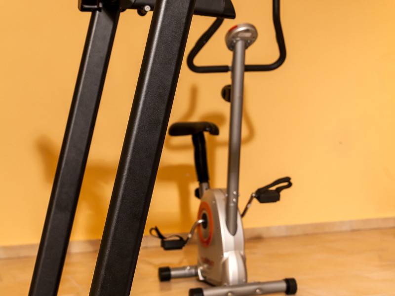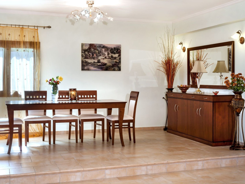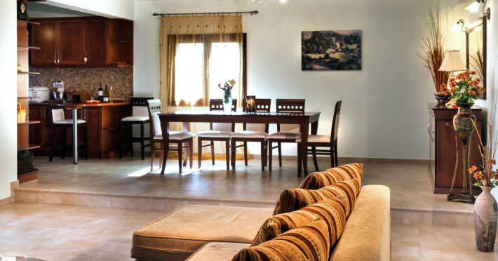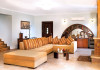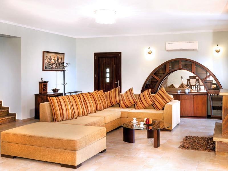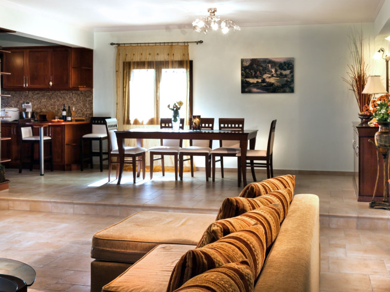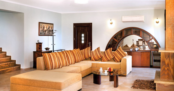 The main entrance in the ground floor opens to a large living room/dining area with a blend of modern and traditional furniture that create a relaxing environment. Large doors open onto the ground floor veranda with access to the garden and outdoor dining facilities for you to enjoy breakfast and light meals. Living rooms is air conditioned. There is also a small bathroom in the ground floor and a large room which is used as the gym when parties of residents consist of up to 6 guests. It can be used as an extra bedroom though; as it can accommodate 2 guests in single beds (most guests use it as child bedroom).