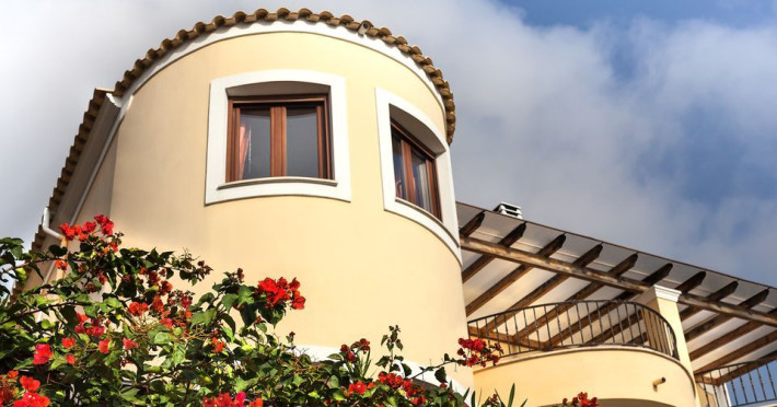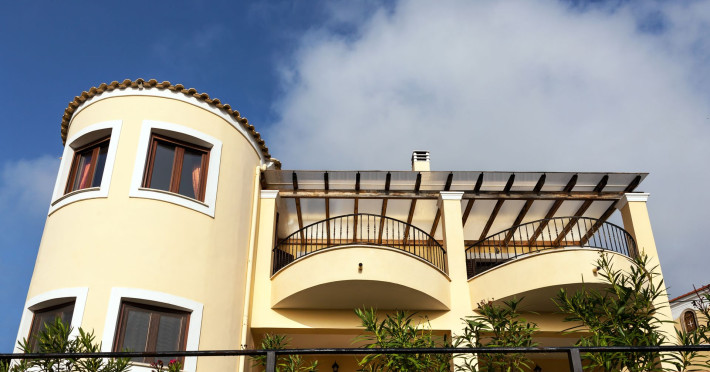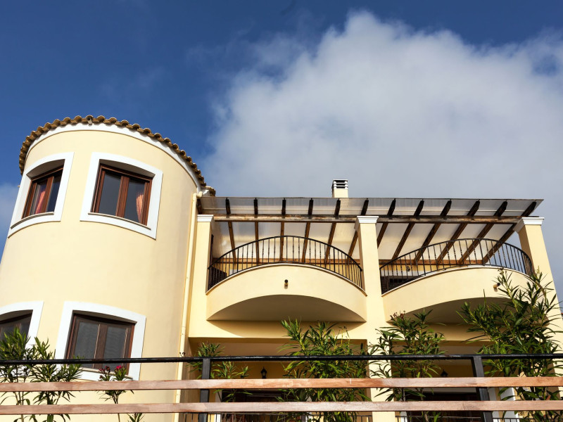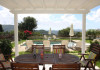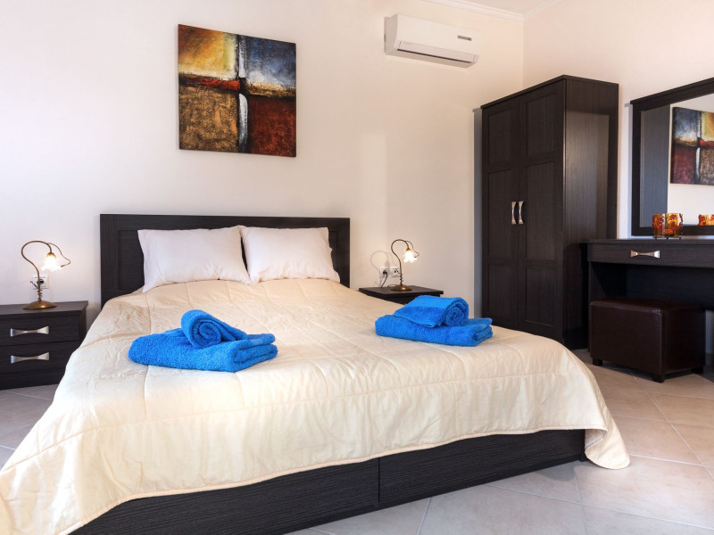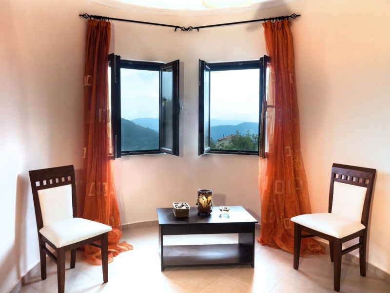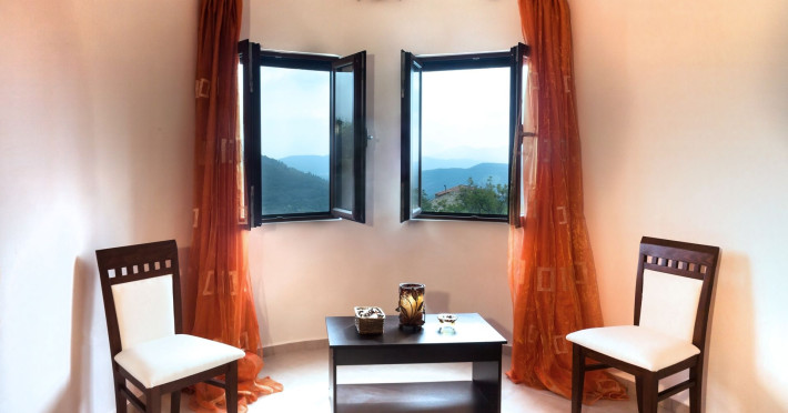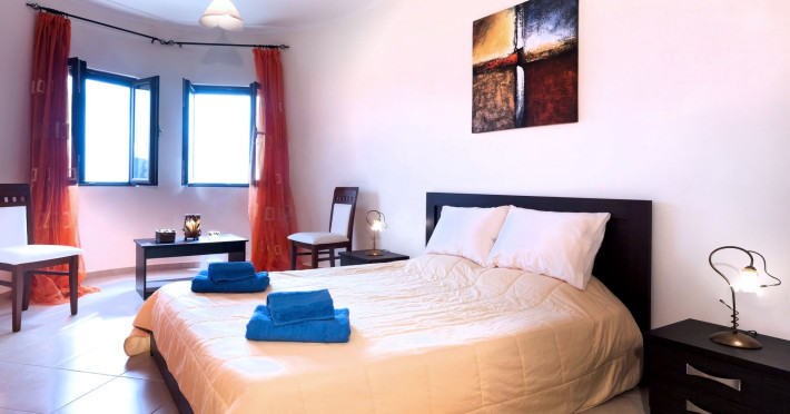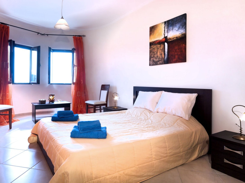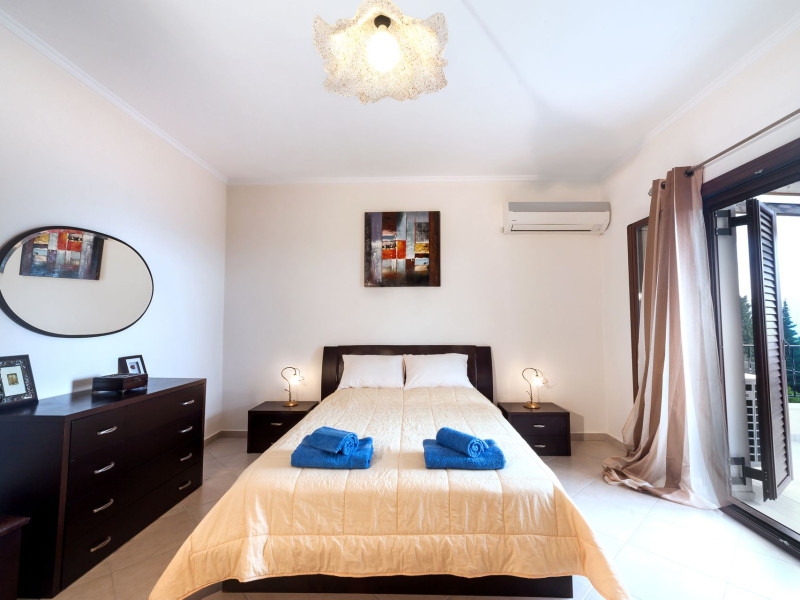 A twin bedroom downstairs (which is also used as the gym) with a small bathroom right outside. All main bedrooms are located in the upper floor. The marbles staircase leads to the upper floor where there are 3 bedrooms. The Master bedroom has a queen size matrimonial bed and en suite bathroom both with shower cabin and a Jacuzzi bathtub and 2 water basins. Another 2 bedrooms (matrimonial beds) downstairs are locate in the same floor, which share another bathroom (with bath tub). Both the master bedroom and one double open to a large, furnished shaded-pergola veranda with stunning views to the open countryside and vast olive groves. Minimal modern furniture and utilities, together with ample space and bright sunlight offer a relaxing decoration and make you want to stay in bed! One of the bedrooms has 2 windows that offer 180 stitch view from inside.
