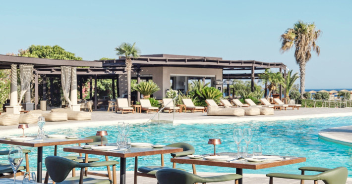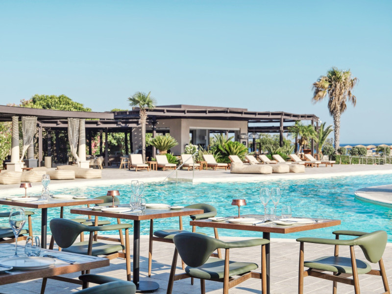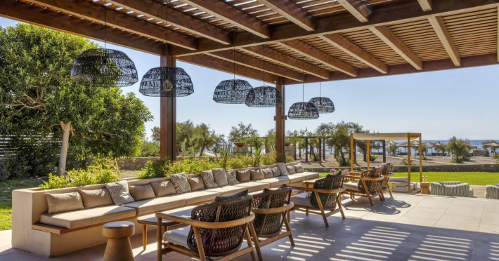 Hotelul ofera: hol de intrare cu receptie, sala comuna cu TV, restaurant principal, restaurant a la carte (grecesc, italian, asiatic), patiserie, bar pe plaja si bauturi racoritoare (nu sunt incluse in all inclusive), bar la piscina si centru de conferinte in hol, galerie comerciala, o cafenea. In exterior, 2 piscine mari, o piscina pentru copii, o terasa la soare cu sezlonguri si umbrele gratuite, un bar la piscina.