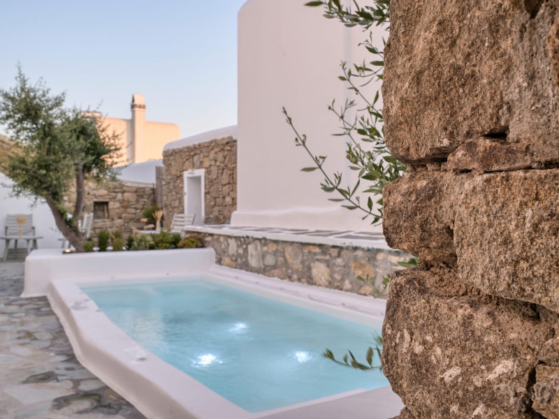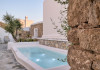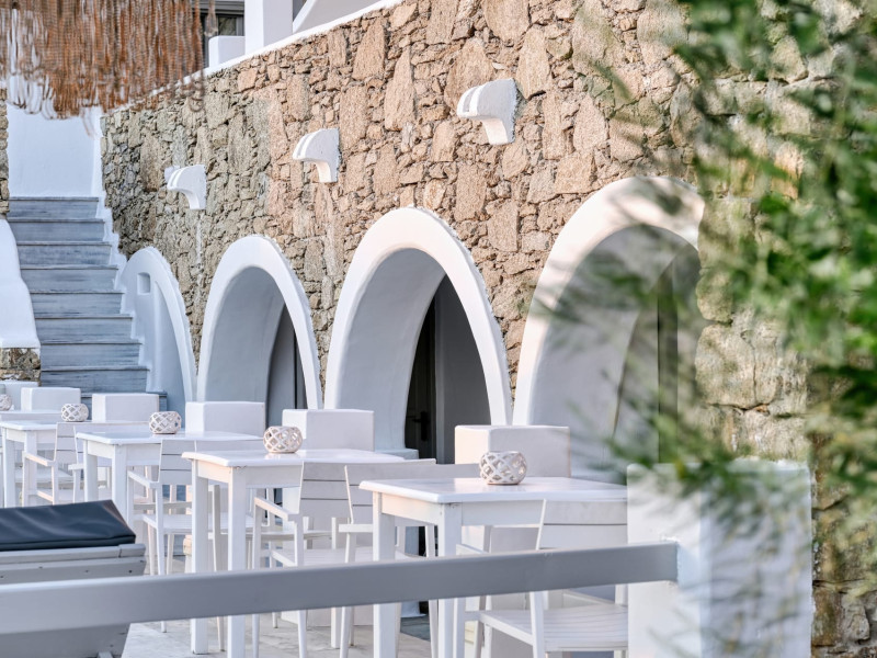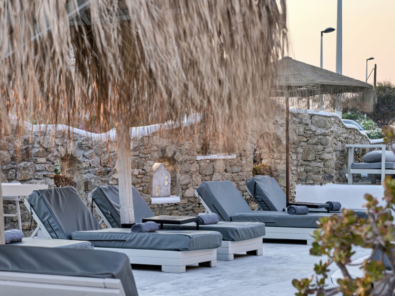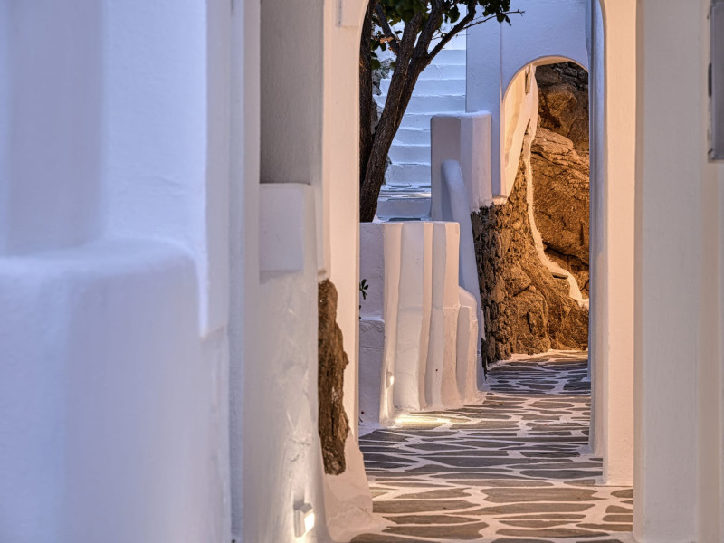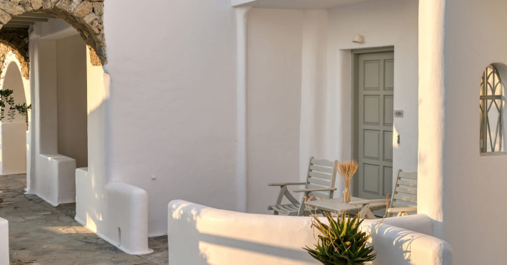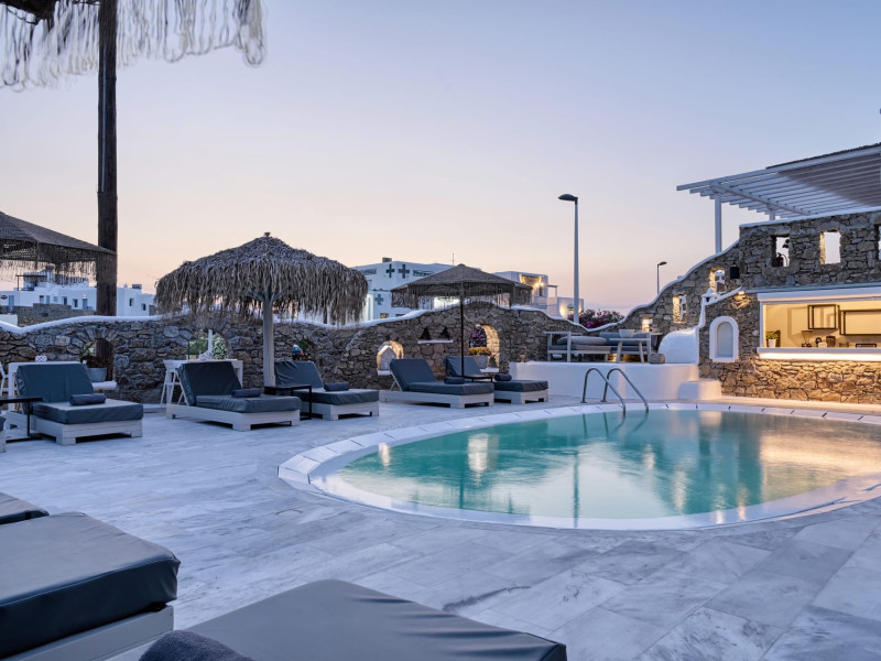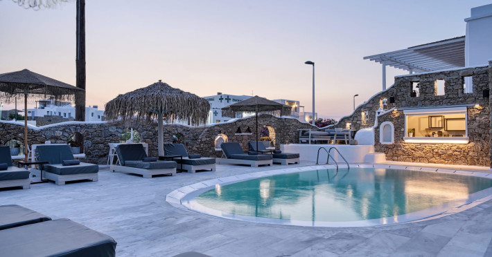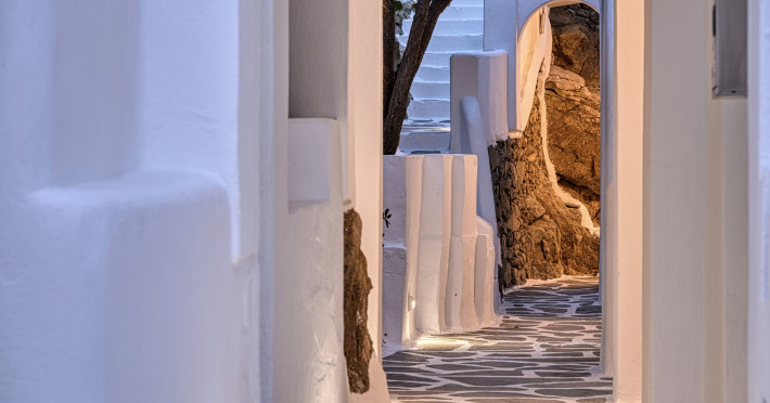 Nodo Boutique Hotel offers its guests the luxury of simplicity combined with the unique Mykonian hospitality.A 4-star small hotel with pleasant communal areas that resemble the narrow streets of Chora — with stairways, patches of greenery, and prominent rock features — a comfortable outdoor jacuzzi for relaxing moments with friends, and a sun-drenched pool next to the pool bar, ensuring you always have a refreshing drink nearby throughout the day.Located within walking distance from shopping centers and Mykonos Town, at a strategic spot just like its name suggests, it provides easy access to all points of interest, making it the ideal choice for your holidays on the island of the winds.The cubic shapes, a signature of traditional architecture, along with arches, stonework, and cement finishes, create curved forms that give the sense of sculpture in both outdoor and indoor spaces.Each day begins harmoniously with a European buffet breakfast featuring many local products and the warm smiles of our courteous staff.Our rooms are minimal yet full of character, designed to meet the needs of every guest — whether dreaming of a peaceful solo escape, a romantic getaway, or a holiday with friends — offering the safety and comfort of a home away from home.