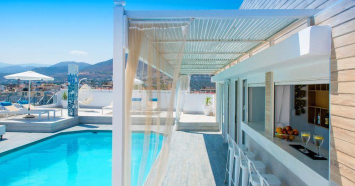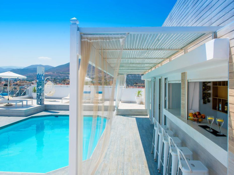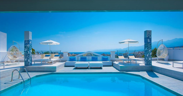 Located in the center of Hersonissos, only 200 meters (3-minute walk) from the beach. All are modernly furnished with minimal design and equipped with air-condition, fridge, living room area and other facilities. All areas of the hotel, including the rooms have free wi-fi access. Senses Blue Boutique Hotel has an amazing Rooftop Pool Bar with unobstructed view to the sea and town of Hersonissos.
