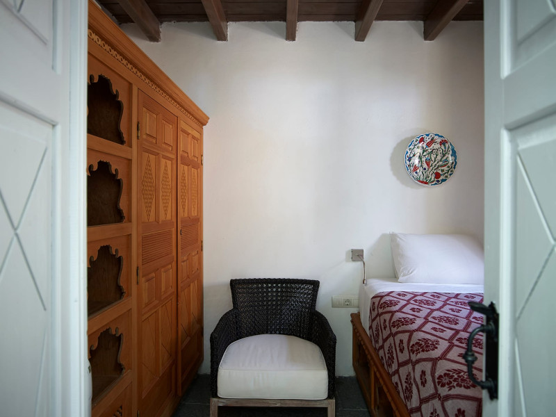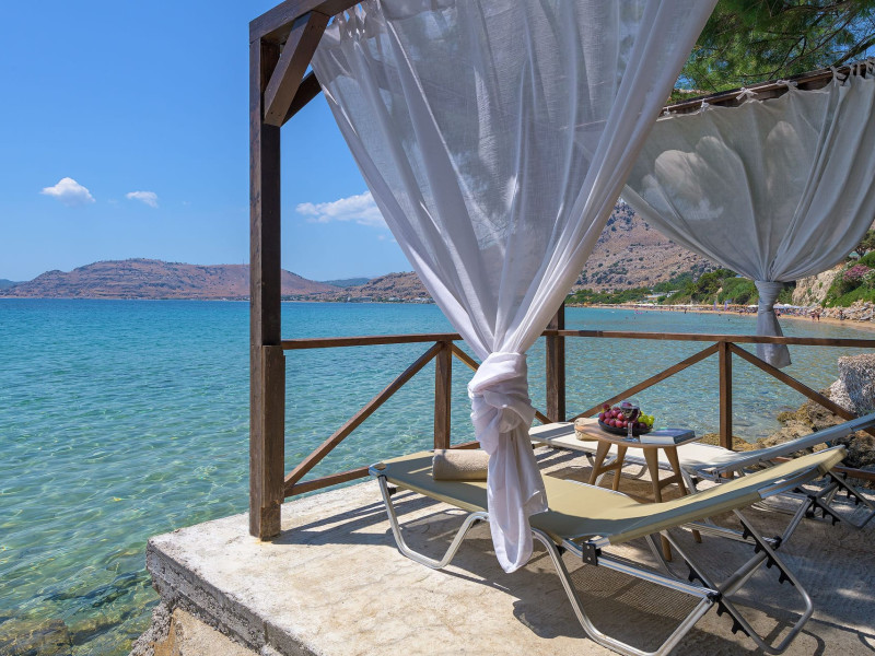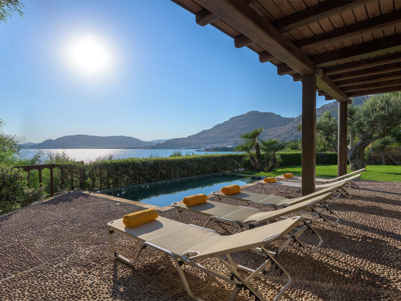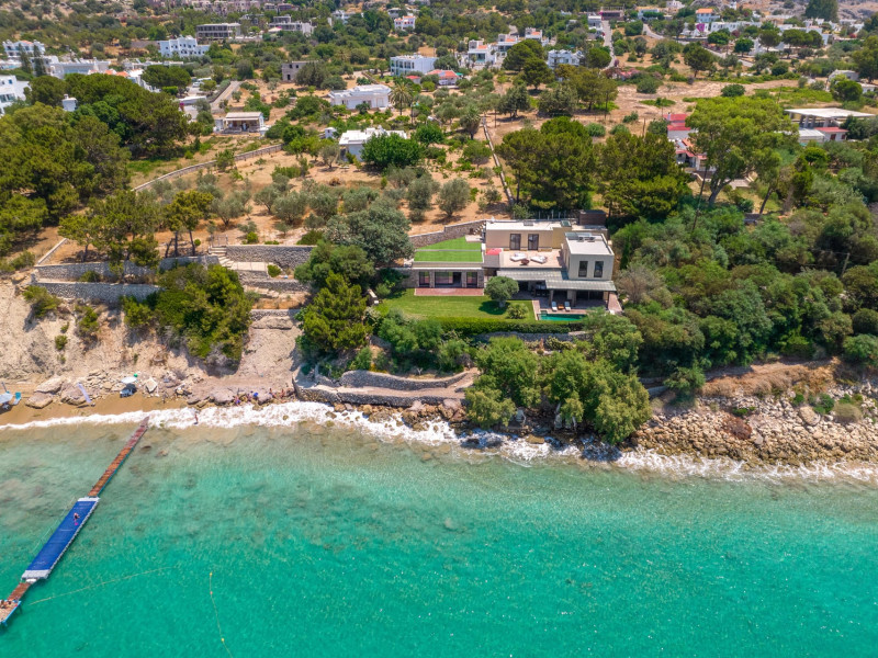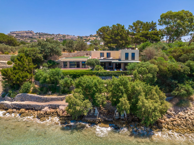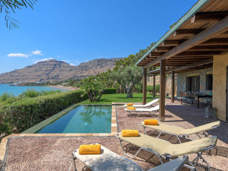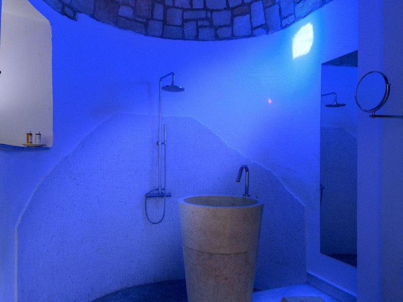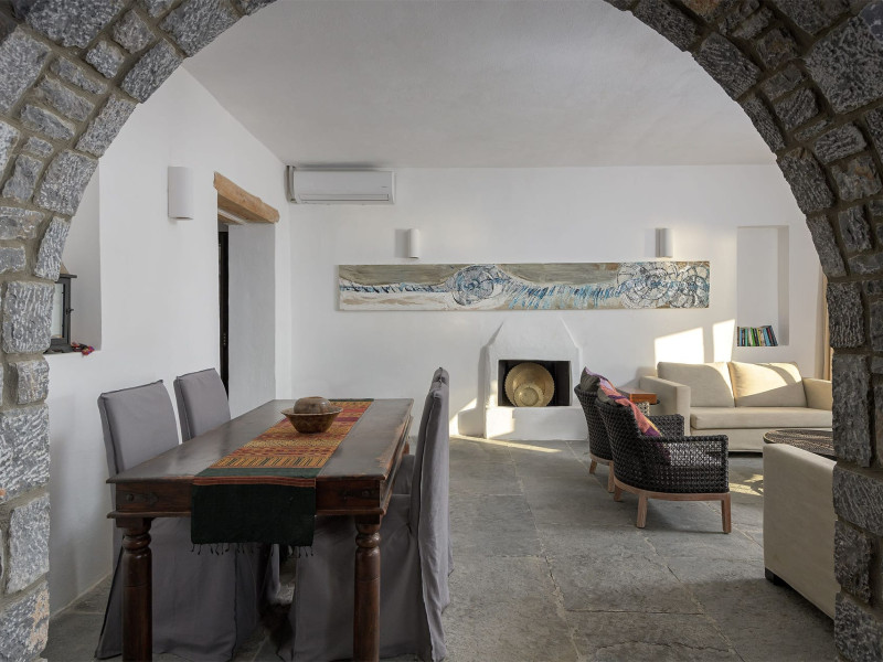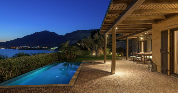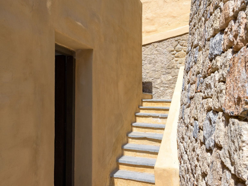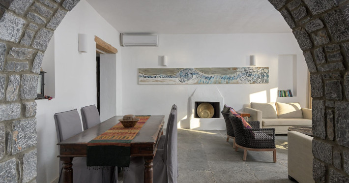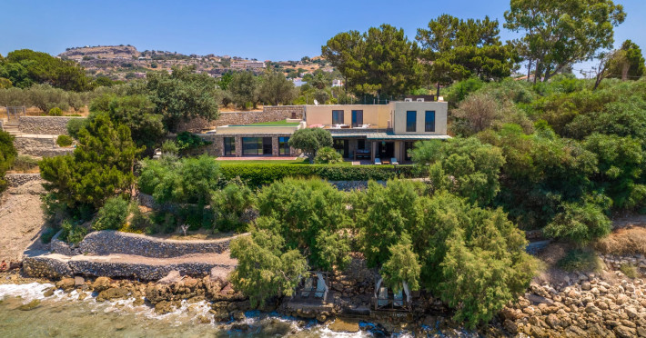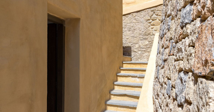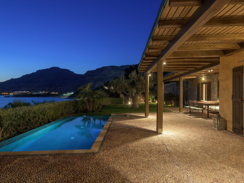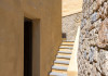 The residence is located in the eastern part of the island at the Pefki location of the Lindos community and at an altitude of 12 meters from sea level. The western end of the plot is located directly by the sea while the slopes, an integral part of the natural relief, delineate the boundaries of the land plot. The particular features of the landscape, the narrow rectangular shape of the plot and the view dictated the linear ground plan.Access is possible using a rural road, on the narrow side of the plot. Particular emphasis was placed to integrate the building with its natural surroundings, so the architectural design of both the building and the landscape were created at the same time and were considered as equally important.The kitchen with the dining room and the living room, extend to the back yard, an area protected from both the wind and the sun. The master bedroom has a half round shaped bathroom with a stone dome, with light filtered by small colored openings. The house has cross natural ventilation and lighting, all day long.Small skylights decorate the areas connecting rooms. The rough building surface, which blends with the natural terrain, and is clearly influenced by the old farmhouses of the area, is made up of uncoated local stone (atsakopetra) and coated surfaces using lava and lime.The inner surfaces were coated and painted with aged limewash. The floors were coated with a local shale stone, while bathroom walls were covered with aged white marble in the shape of a mosaic stone. The outdoor yard is covered with pebbles. The main features of the flat roof are the trusses and wooden planks to gaps between trusses. Inside lighting is adjustable making reference to candle light.