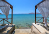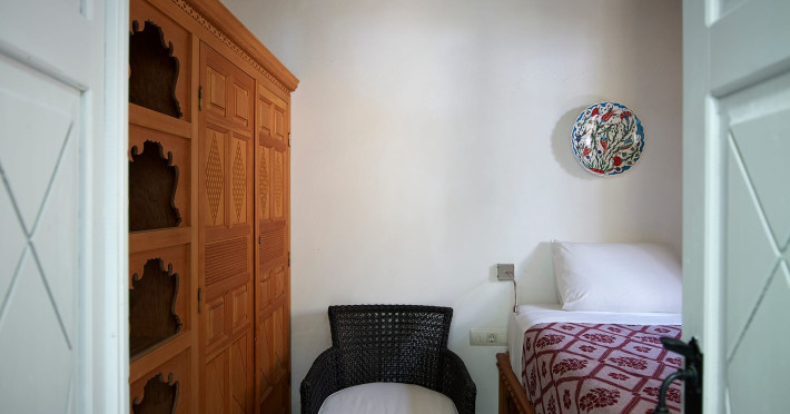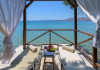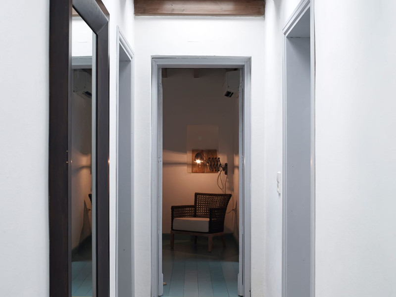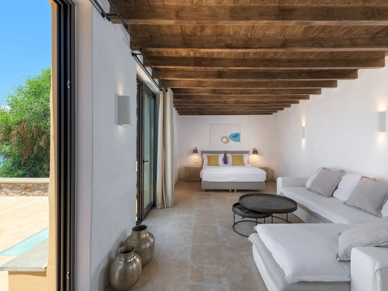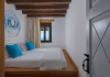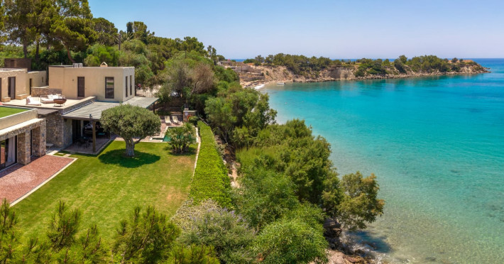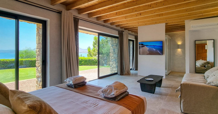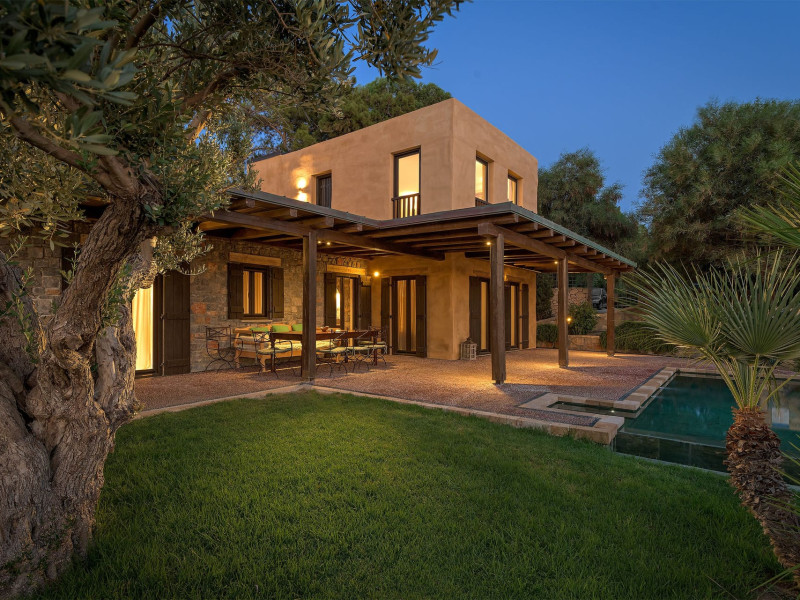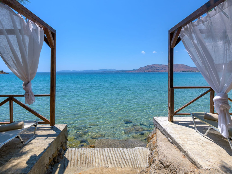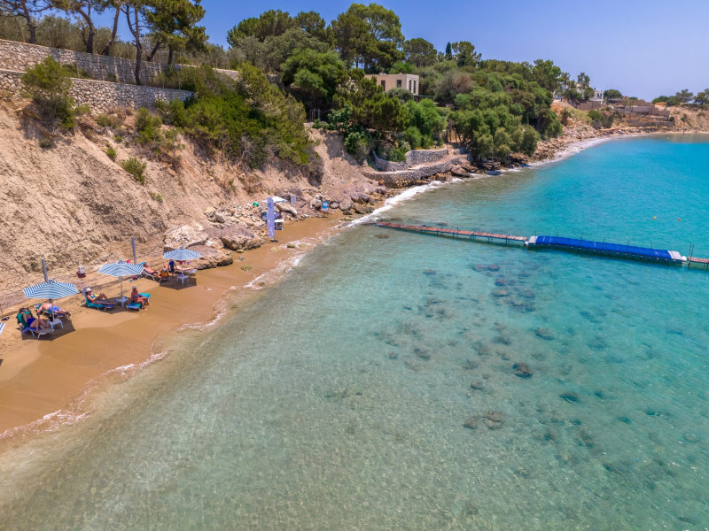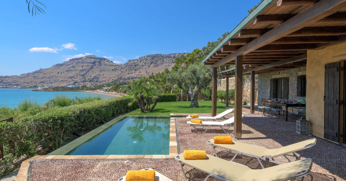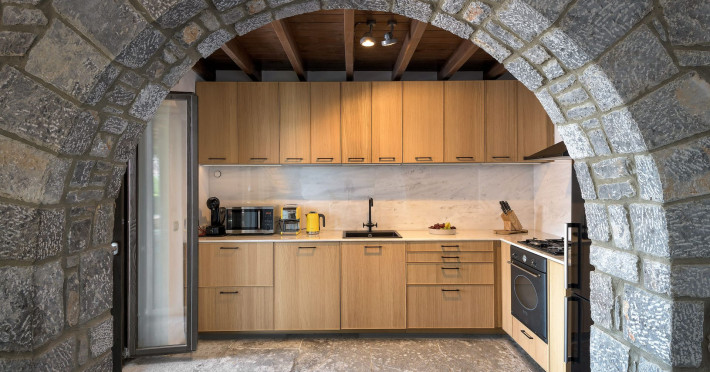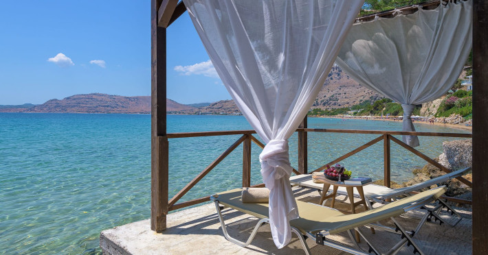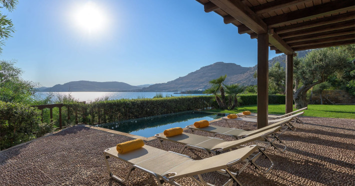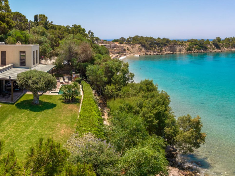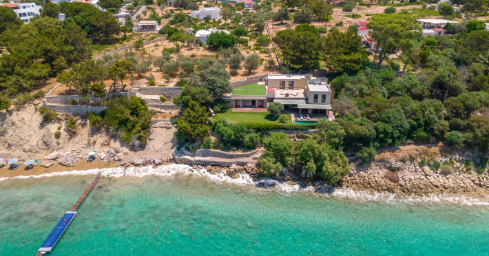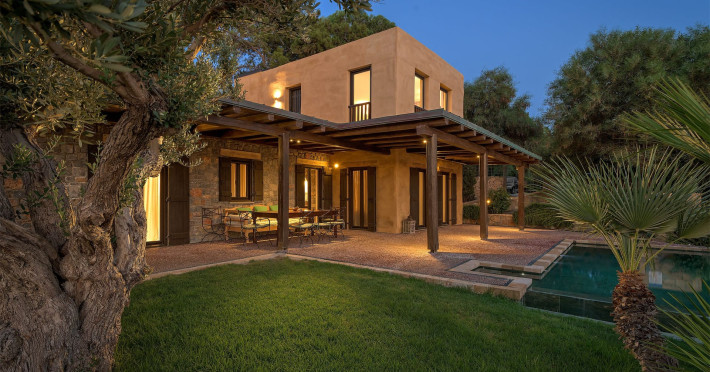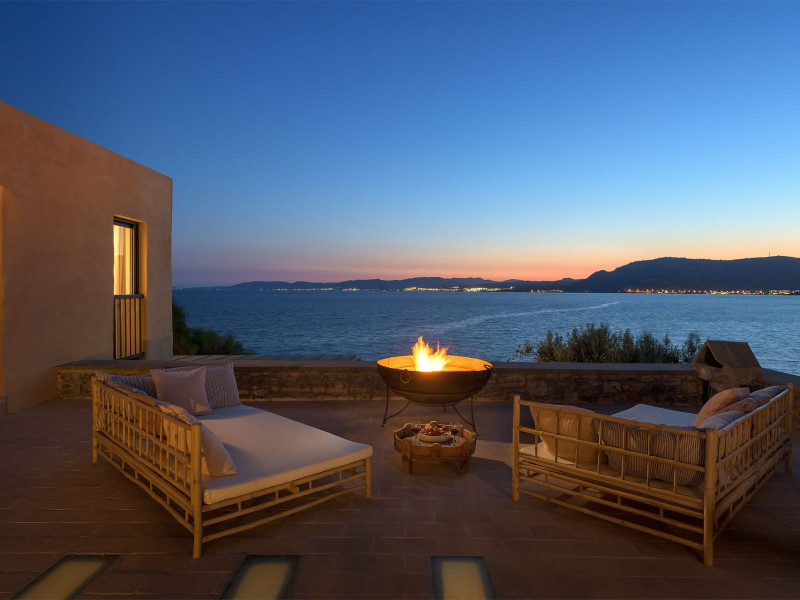 The residence is located in the eastern part of the island at the Pefki location of the Lindos community and at an altitude of 12 meters from sea level. The western end of the plot is located directly by the sea while the slopes, an integral part of the natural relief, delineate the boundaries of the land plot. The particular features of the landscape, the narrow rectangular shape of the plot and the view dictated the linear ground plan.Access is possible using a rural road, on the narrow side of the plot. Particular emphasis was placed to integrate the building with its natural surroundings, so the architectural design of both the building and the landscape were created at the same time and were considered as equally important.The kitchen with the dining room and the living room, extend to the back yard, an area protected from both the wind and the sun. The master bedroom has a half round shaped bathroom with a stone dome, with light filtered by small colored openings. The house has cross natural ventilation and lighting, all day long.Small skylights decorate the areas connecting rooms. The rough building surface, which blends with the natural terrain, and is clearly influenced by the old farmhouses of the area, is made up of uncoated local stone (atsakopetra) and coated surfaces using lava and lime.The inner surfaces were coated and painted with aged limewash. The floors were coated with a local shale stone, while bathroom walls were covered with aged white marble in the shape of a mosaic stone. The outdoor yard is covered with pebbles. The main features of the flat roof are the trusses and wooden planks to gaps between trusses. Inside lighting is adjustable making reference to candle light.
