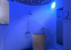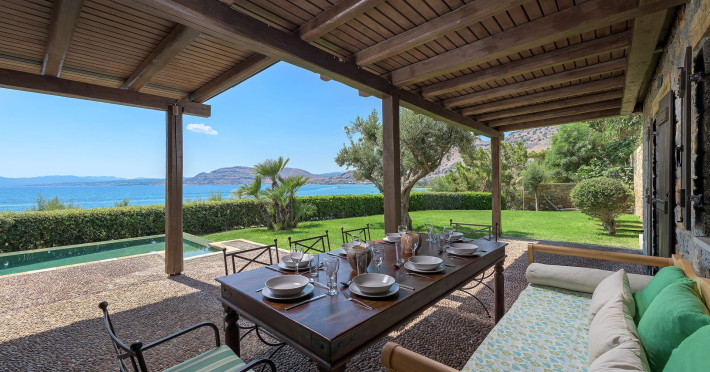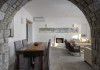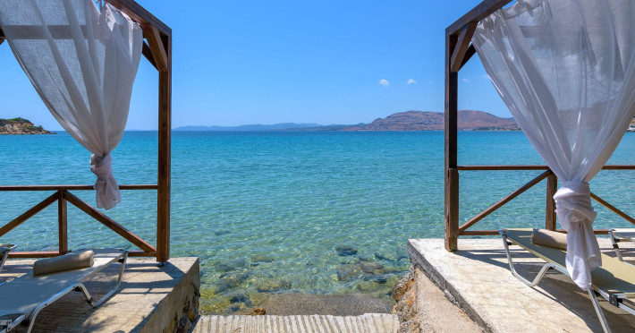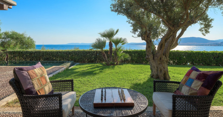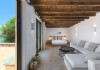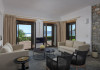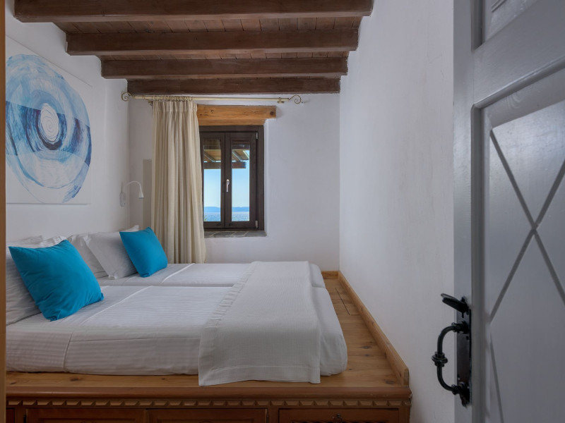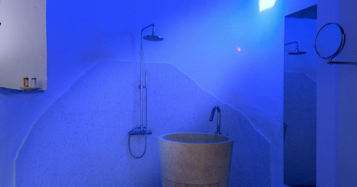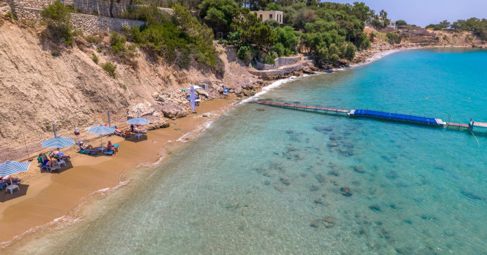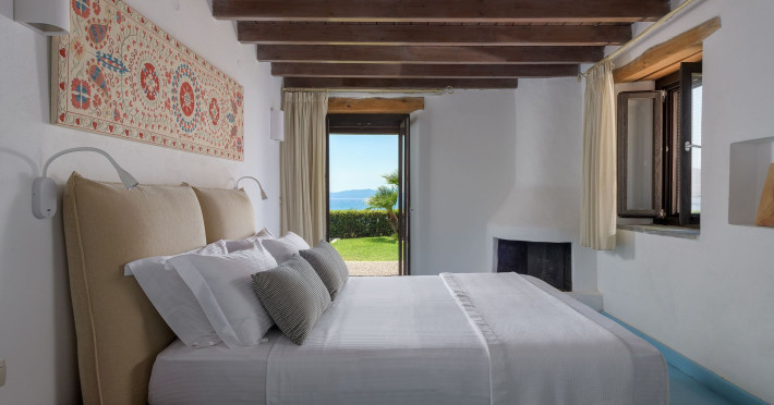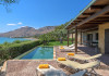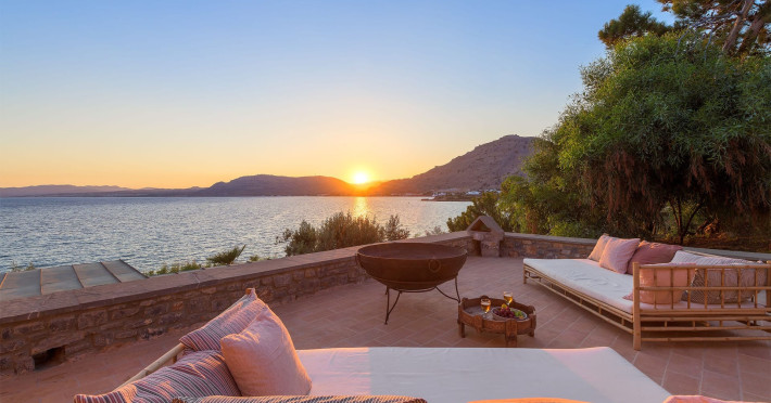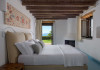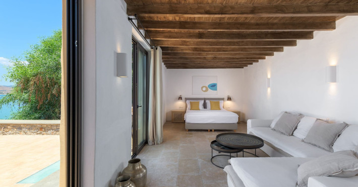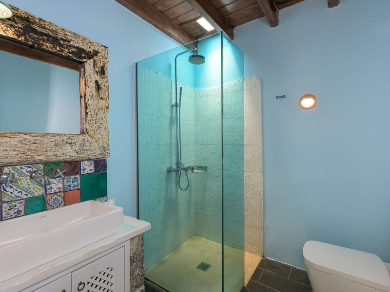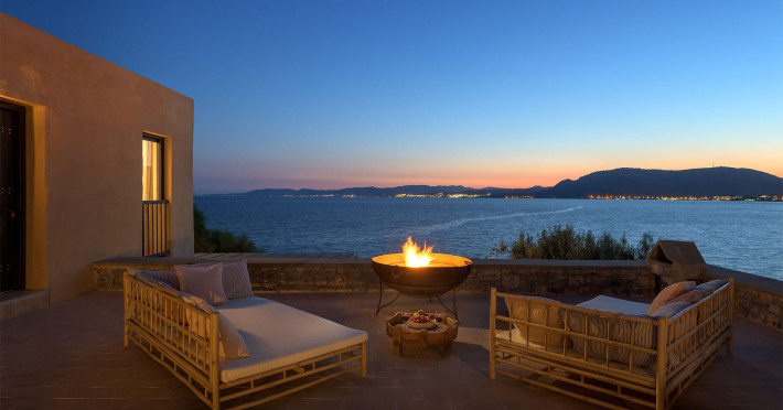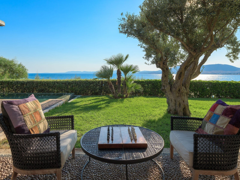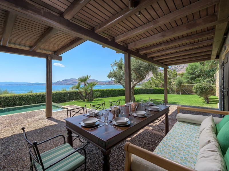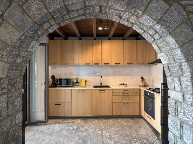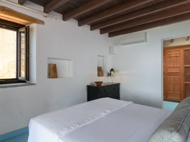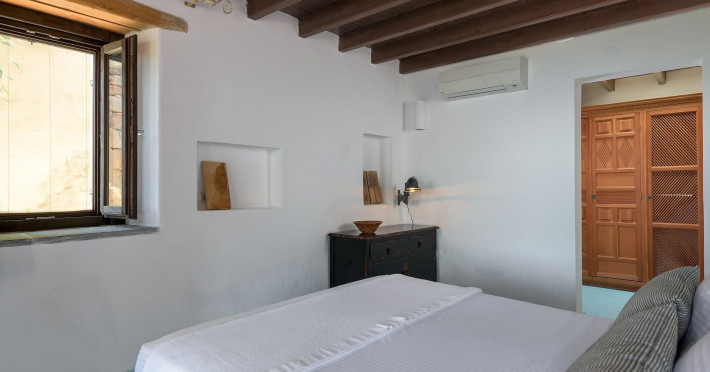 The residence is located in the eastern part of the island at the Pefki location of the Lindos community and at an altitude of 12 meters from sea level. The western end of the plot is located directly by the sea while the slopes, an integral part of the natural relief, delineate the boundaries of the land plot. The particular features of the landscape, the narrow rectangular shape of the plot and the view dictated the linear ground plan.Access is possible using a rural road, on the narrow side of the plot. Particular emphasis was placed to integrate the building with its natural surroundings, so the architectural design of both the building and the landscape were created at the same time and were considered as equally important.The kitchen with the dining room and the living room, extend to the back yard, an area protected from both the wind and the sun. The master bedroom has a half round shaped bathroom with a stone dome, with light filtered by small colored openings. The house has cross natural ventilation and lighting, all day long.Small skylights decorate the areas connecting rooms. The rough building surface, which blends with the natural terrain, and is clearly influenced by the old farmhouses of the area, is made up of uncoated local stone (atsakopetra) and coated surfaces using lava and lime.The inner surfaces were coated and painted with aged limewash. The floors were coated with a local shale stone, while bathroom walls were covered with aged white marble in the shape of a mosaic stone. The outdoor yard is covered with pebbles. The main features of the flat roof are the trusses and wooden planks to gaps between trusses. Inside lighting is adjustable making reference to candle light.